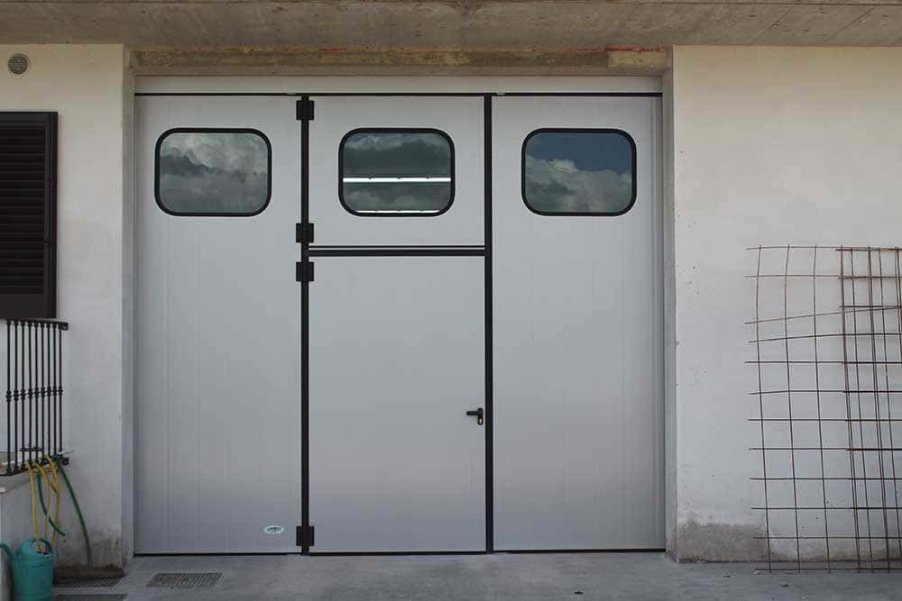 Due cerniere marchiate CE regolabili in altezza delle quali una con molla e cuscinetto a sfere per autochiusura. Serratura marchiata CE. Due rostri di tenuta lato cerniere. Maniglia antimpigliamento a norma DIN. Guarnizione termoespandente inserita nell’alloggiamento del telaio.
